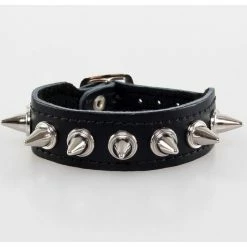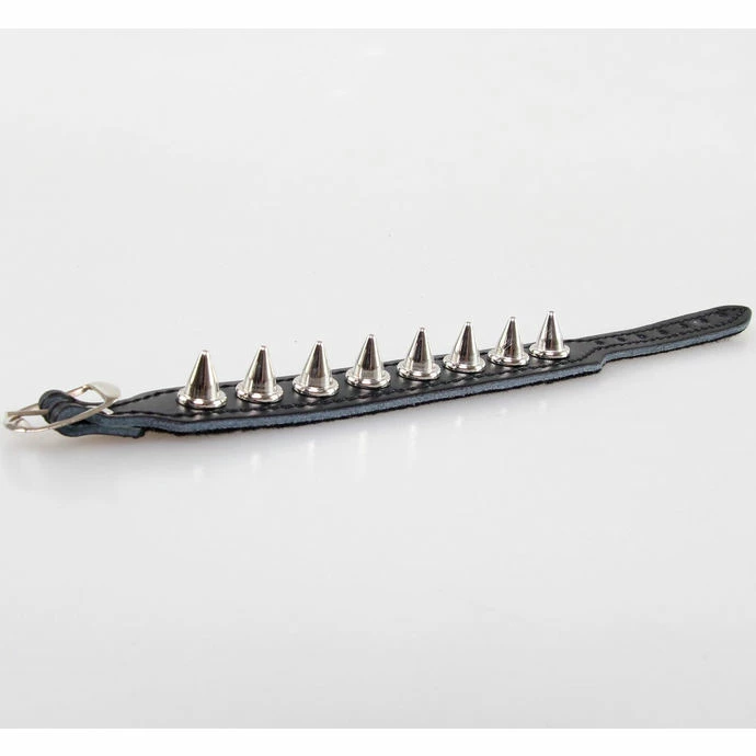 1 row bracelet with spikes. Composition: synthetic leather, metallic silver spikes. For wrist approx .: 16-22 cm. The total length of the bracelet approx .: 24.5 cm. The height of the cone of approx .: 1.3 cm. The width of the cone at the bottom of approx .: 1.1 cm. The width of the bracelet approx .: 2.4 cm. Number of cones: 8kusů.